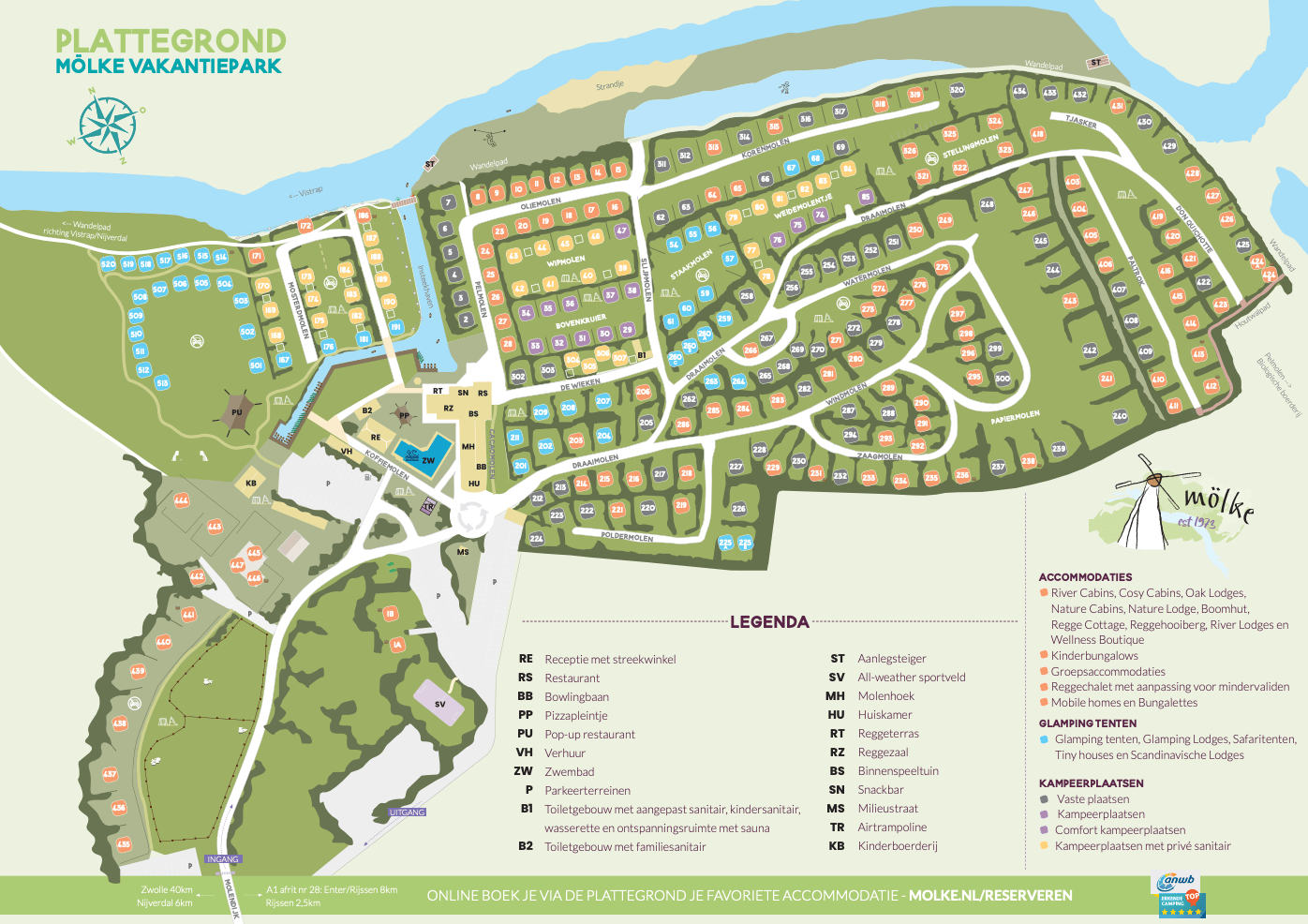 Het park beschikt over oplaadpunten voor elektrische auto’s, een informatiepunt en een wasserette. Mölke ligt op de grens van Twente en Salland, omringd door natuurgebieden zoals de Sallandse Heuvelrug en de Holterberg. Je kunt gratis omboeken tot 7 dagen van tevoren (bij mindervaliden accommodaties). In sommige weken per jaar organiseert het park de Wijn & Wellness weken. Tijdens Pasen, Hemelvaart, Pinksteren en de zomervakantie zijn er Slow Sunday Vibes met live sing & songwriters uit de buurt. Je hond is aangelijnd en sociaal welkom op kampeerplaatsen en in bepaalde vakantiehuizen. Na boeking ontvang je van kantoorhond Tommie een mail met hondenlosloopgebieden en hondvriendelijke terrassen in de omgeving.