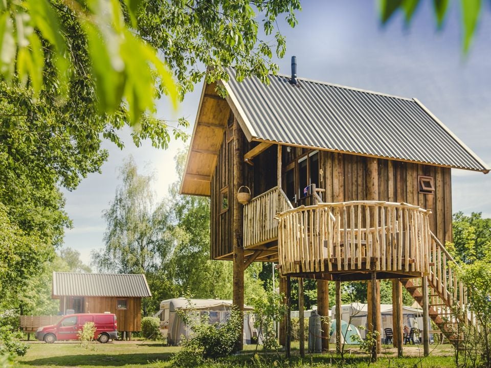 🌳🛖 De boomhut is misschien wel de leukste accommodatie op het park: op 4 meter hoogte met uitzicht over de Regge, geschikt voor maximaal 5 personen, volledig ingericht met eigen sanitair, keuken met fornuis en koelkast, en een terras met meubels. Er is daarnaast ook een hooiberghut waar je verblijft in een hooiberg met rieten dak.