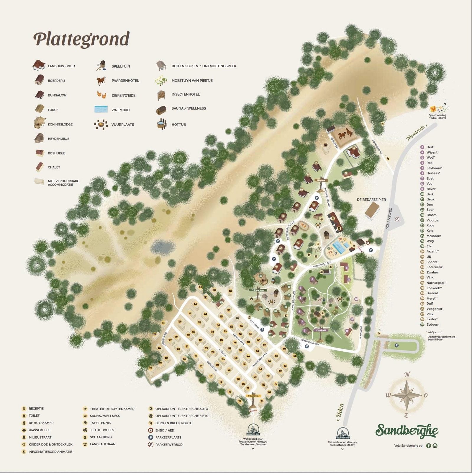 Vakantiepark Sandberghe ligt tegen de stuifduinen van Bedaf, midden in het prachtige natuurgebied De Maashorst. Dit kleinschalige park biedt jullie verwarmd buitenzwembad, een enthousiast Doe & Ontdekteam voor de kinderen, een barrel sauna om helemaal tot rust te komen, én zelfs een paardenhotel voor wie met zijn eigen paard op vakantie wil. Het park is verdeeld in vier unieke delen, elk met hun eigen sfeer en accommodaties. Van glamping safarilodges tot luxe villa’s met privé bubbelbad: hier vind je precies de plek die bij jou past.