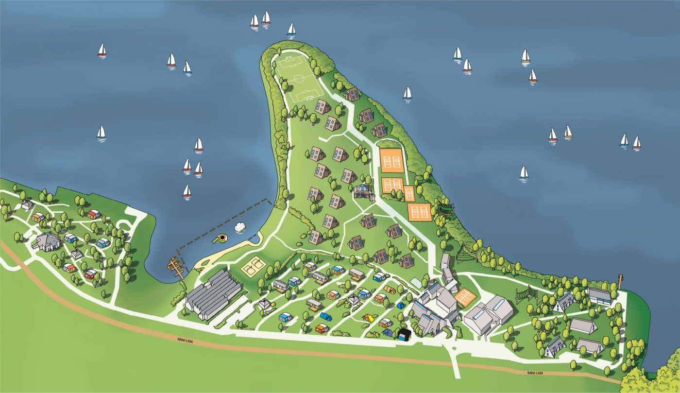 Tussen de huisjes rijden geen auto’s, dus de kinderen kunnen vrij rondlopen op het terrein waar zich een speeltuin, petanquebaan, stenen pingpongtafels en een discgolfparcours bevinden. Als overnachtende gast heb je tijdens gratis toegang tot het zwembad.