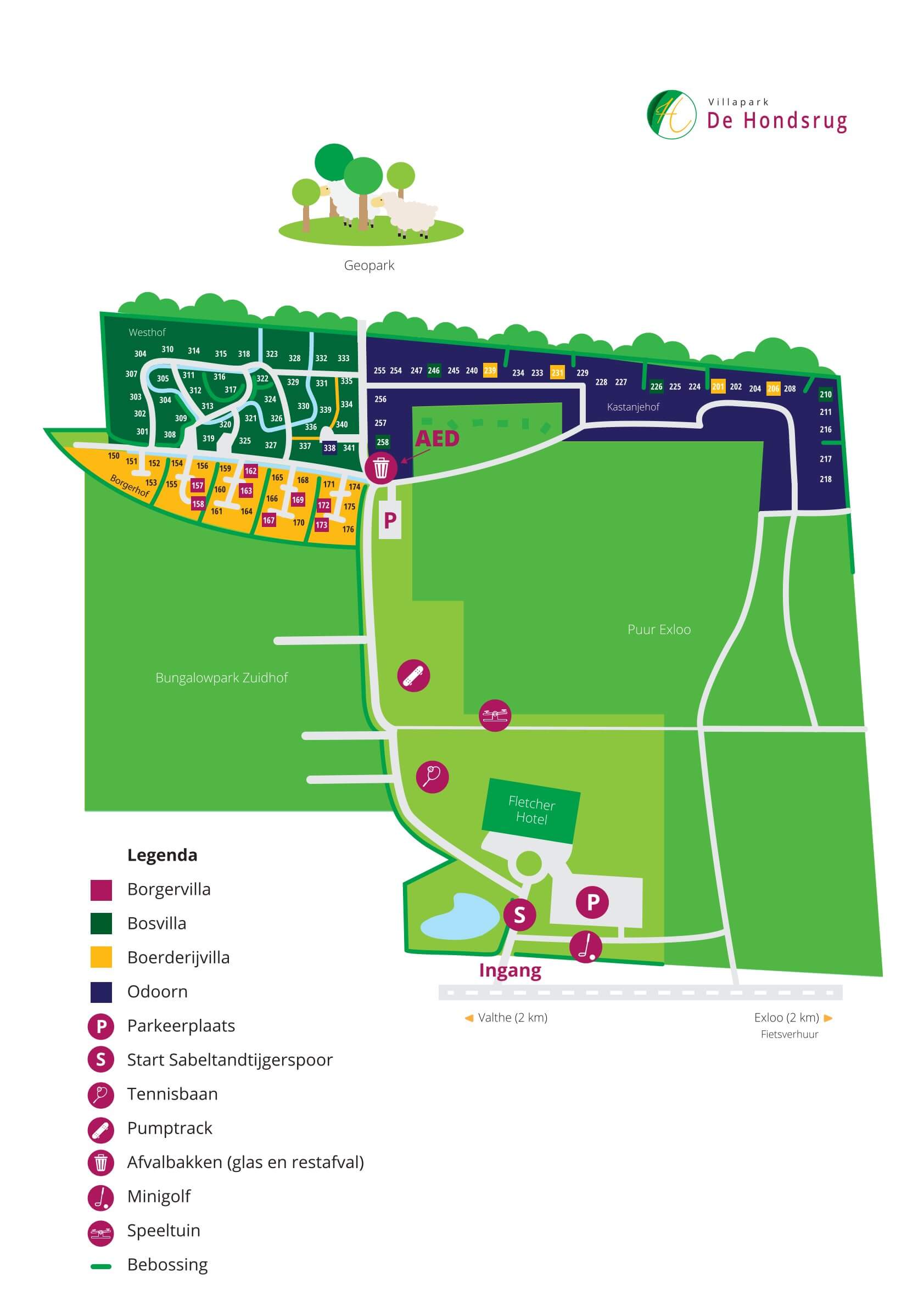 Villapark De Hondsrug ligt in het dorpje Exloo in Drenthe, direct aan het UNESCO-natuurgebied De Hondsrug. Het park bevindt zich op 11 km van station Emmen en 12 km van het centrum van Emmen. De locatie biedt directe toegang tot de uitgestrekte heidevelden en bossen van de Drentse Hondsrug. Groningen ligt op rijafstand naar het noorden, terwijl je binnen 15 minuten in Emmen bent voor voorzieningen. Het park is omgeven door wandel- en fietsroutes door de natuurrijke omgeving tussen bos en heide.