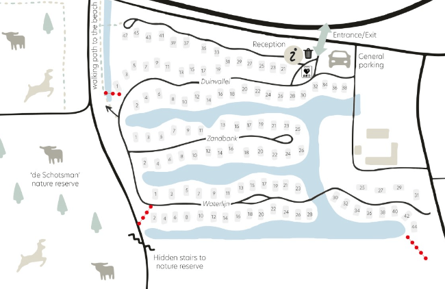 Het Banjaardstrand ligt op enkele minuten loopafstand en is één van de breedste stranden van Nederland. Dit echte familiestrand nodigt uit voor lange strandwandelingen en gezellige stranddagen. Direct aangrenzend aan het park ligt natuurgebied De Schotsman, een oergebied gevormd door wind en water met uitgestrekte graslanden, wilde orchideeën en bossen. Hier spot je reeën, Schotse Hooglanders en talloze vogelsoorten. De gemarkeerde wandelroutes door dit gebied zijn een absolute aanrader, vooral tijdens een vroege ochtendwandeling.